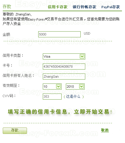 信用卡存款:如果您希望立即使用Easy-Forex交易平台进行交易,请为您的帐户存入资金,Easy-Forex支持使用信用卡直接入金,如果您希望使用银行转帐和PayPal存款,请联系您的帐户经理,获得与此相关的信息。