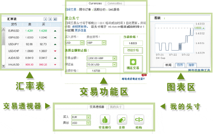 交易区有汇率表、交易功能区、图表区、交易透视器等几部分。