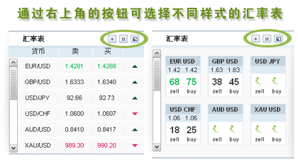 通过右上角的按钮可选择不同样式的汇率表,点击相应货币对即可做出买入或卖出交易。