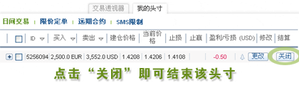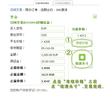 点击“关闭”即可结束该头寸: 在接下来的窗口点击“冻结价格”,然后点结清头寸,即完成交易。