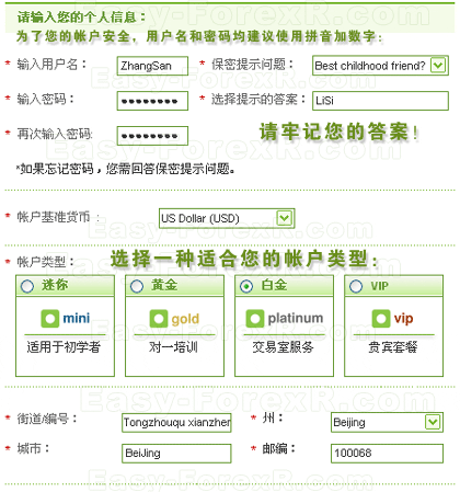第二步: 填写交易帐户的相关信息。Easy-Forex提供4种交易帐户,请根据情况选择适合自己的投资帐户。